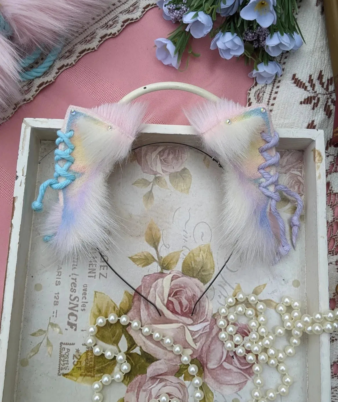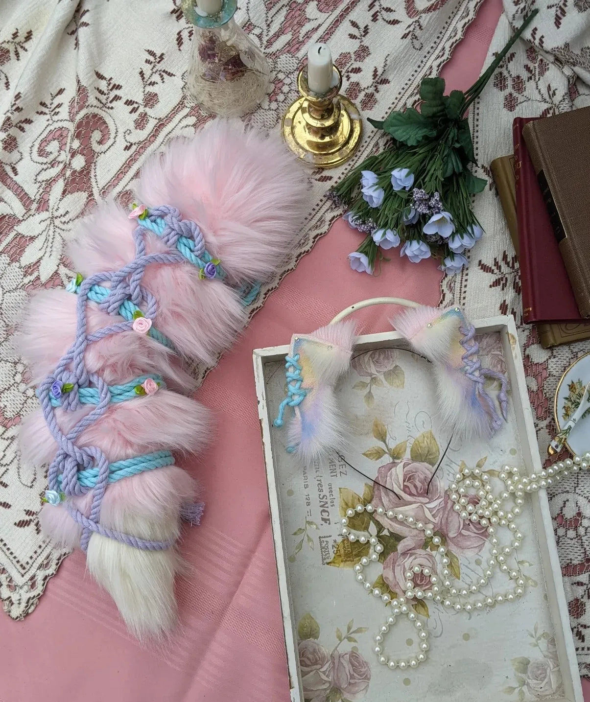 part of our "soft shibari" inspired collection, this lovingly hand crafted faux fur kitten set is hand painted and trimmed with attention to detail.